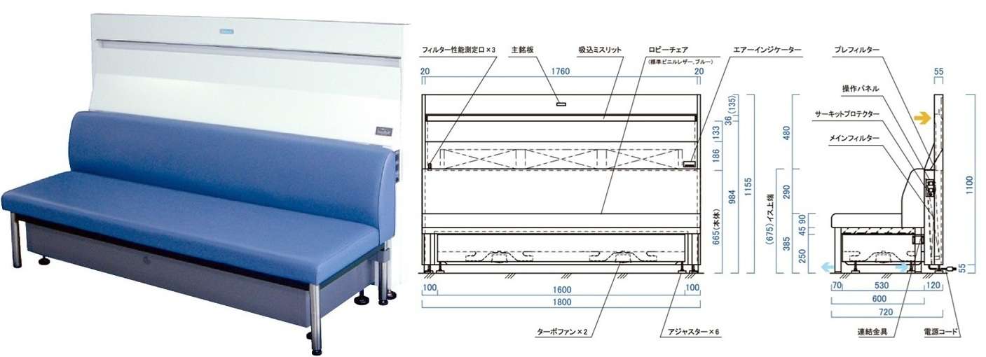 ●背もたれ後方スリットから吸込気流により、患者さん相互の空気感染や菌の拡散を防ぎます。