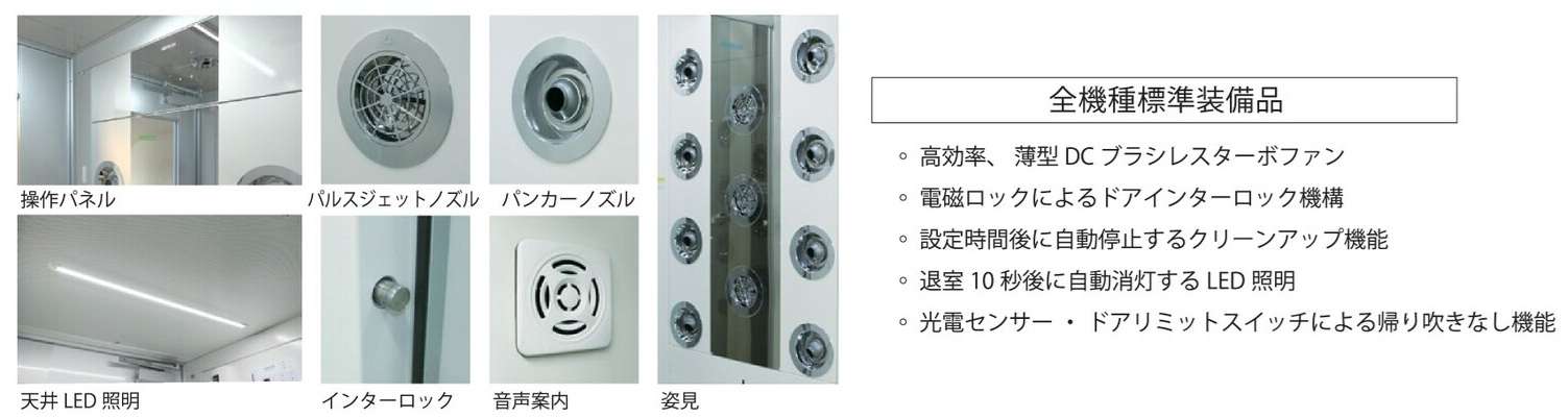 人や搬入物の表面に付着した塵埃などの粒子を高速ジェットエアーにより除塵します。