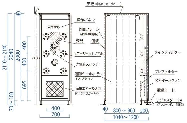 ●設置条件に合わせて、エアーシャワーの高さ、幅を調整することができます。