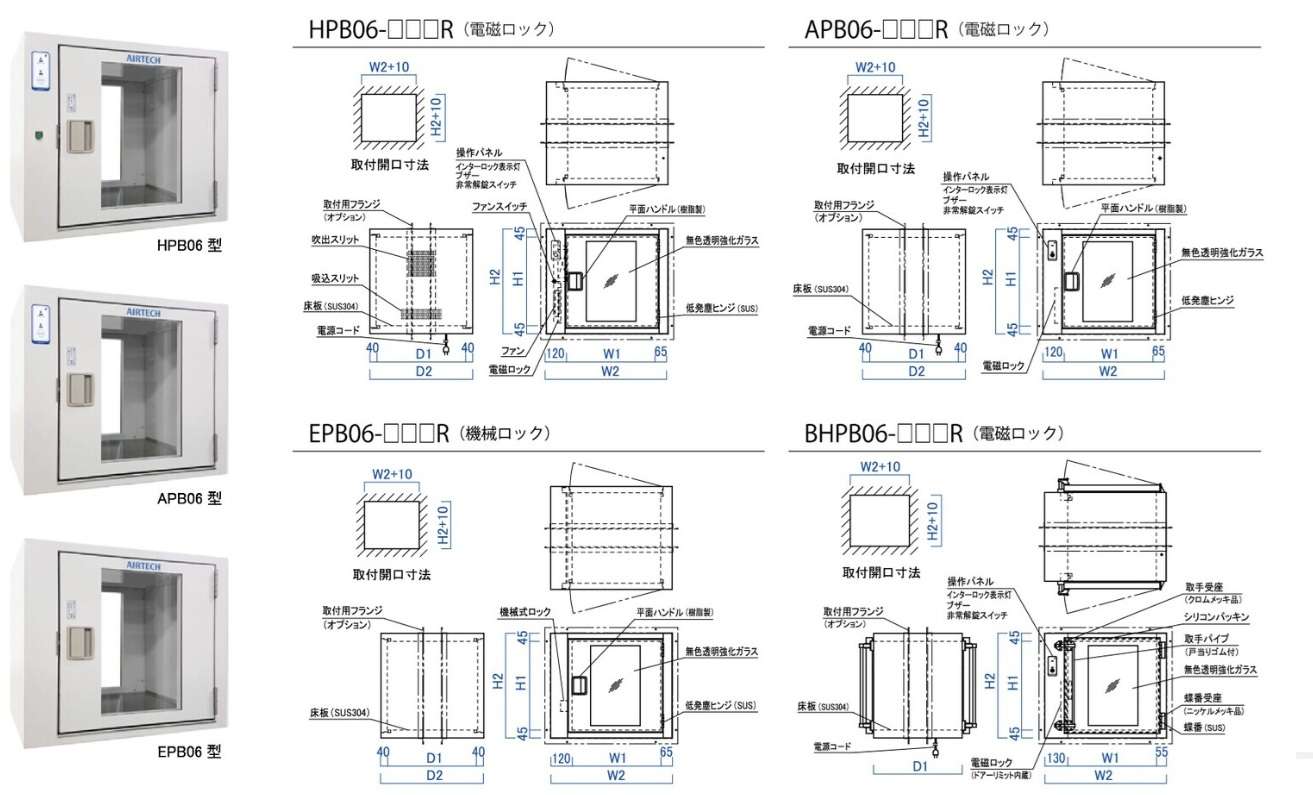 防ぎます。AIRTECH製パスボックスは小物用標準品から大型物品用特殊品まで
