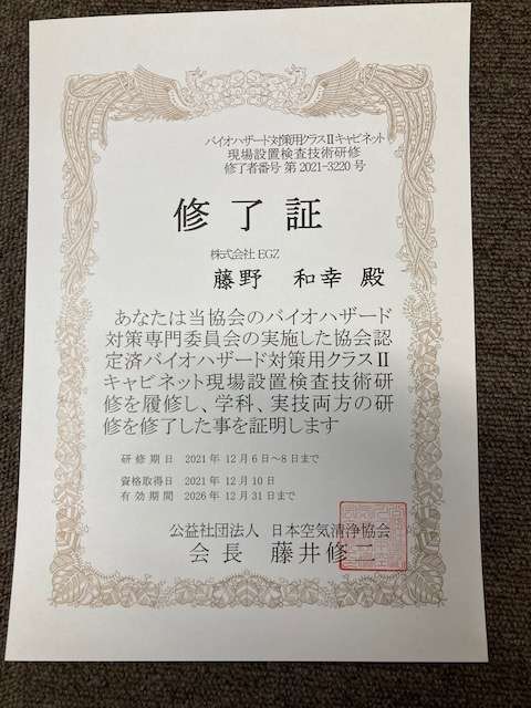 この度年末に、『バイオハザード対策用クラスⅡキャビネット 現場設置検査技術研修』を終了しました!